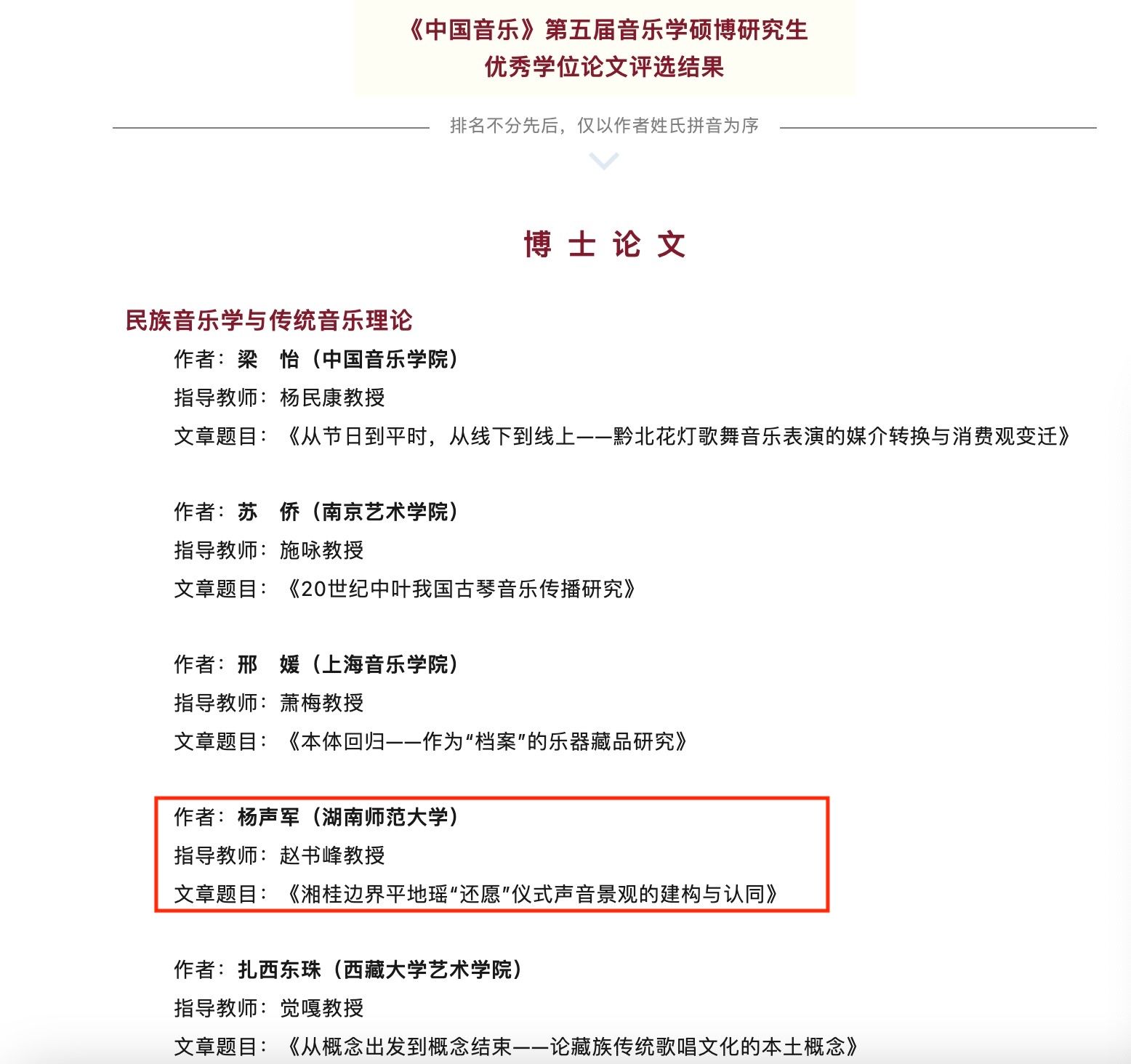 近日,由中国音乐学院、《中国音乐》杂志社主办的第五届音乐学硕博研究生优秀学位论文评选结果公布,beat365音乐舞蹈学院理论教研室博士杨声军老师的博士学位论文《湘桂边界平地瑶“还愿”仪式声音景观的建构与认同》获评优秀博士学位论文(全国21人)。