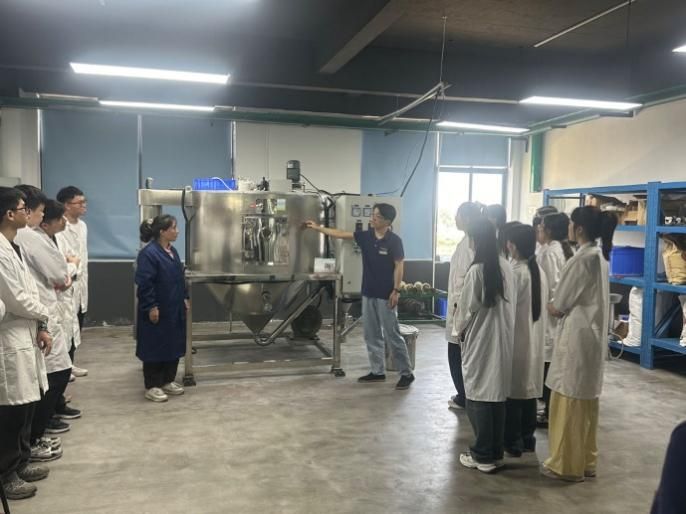 在造粒车间和省级工程技术研究中心实验室,学生们亲身参与了量产级和实验室级的喷雾造粒过程。教学团队和现场工程师为学生们详细讲解了造粒塔的原理、结构以及工艺技术要求,并现场解答了学生们的疑问。