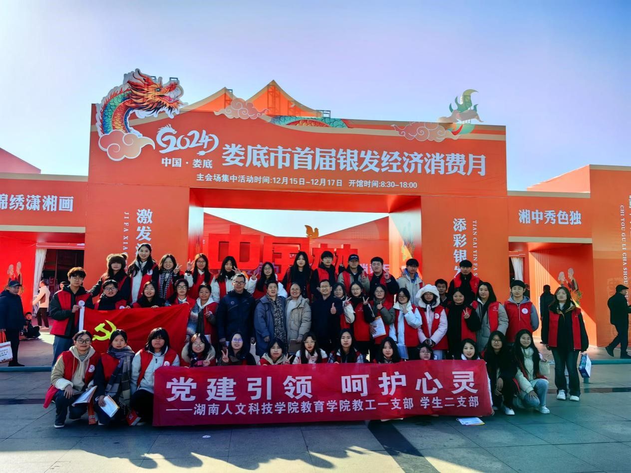 12月13日至18日,教工第一支部部分教师党员与教育学院学生第二党支部部分学生党员带领应用心理学专业学生志愿者,在孙水河公园、娄星广场等地,为娄底市首届“银发经济消费月”的启动仪式的准备及活动提供丰富多彩的志愿服务。服务娄底市民15000多人次。为提升娄底市老年人的心理健康水平,促进银发经济消费,构建和谐娄底、健康娄底、幸福娄底贡献专业力量。