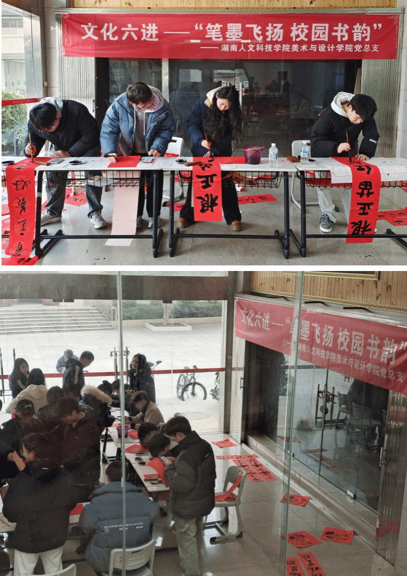 为深入学习贯彻习近平文化思想,传承和弘扬中华优秀传统文化。12月23日至25日,美术与设计学院党总支创新党建活动形式,组织书法学专业师生党员开展“文化六进——笔墨飞扬 校园书韵”主题党日活动,先后在南风苑小区、学校食堂、逸夫楼等地写赠春联。学院党总支书记阳立新、院长陆序彦、党总支副书记黄庆源、教工第二党支部书记彭建成、专职组织员柳泽伟等参加活动。