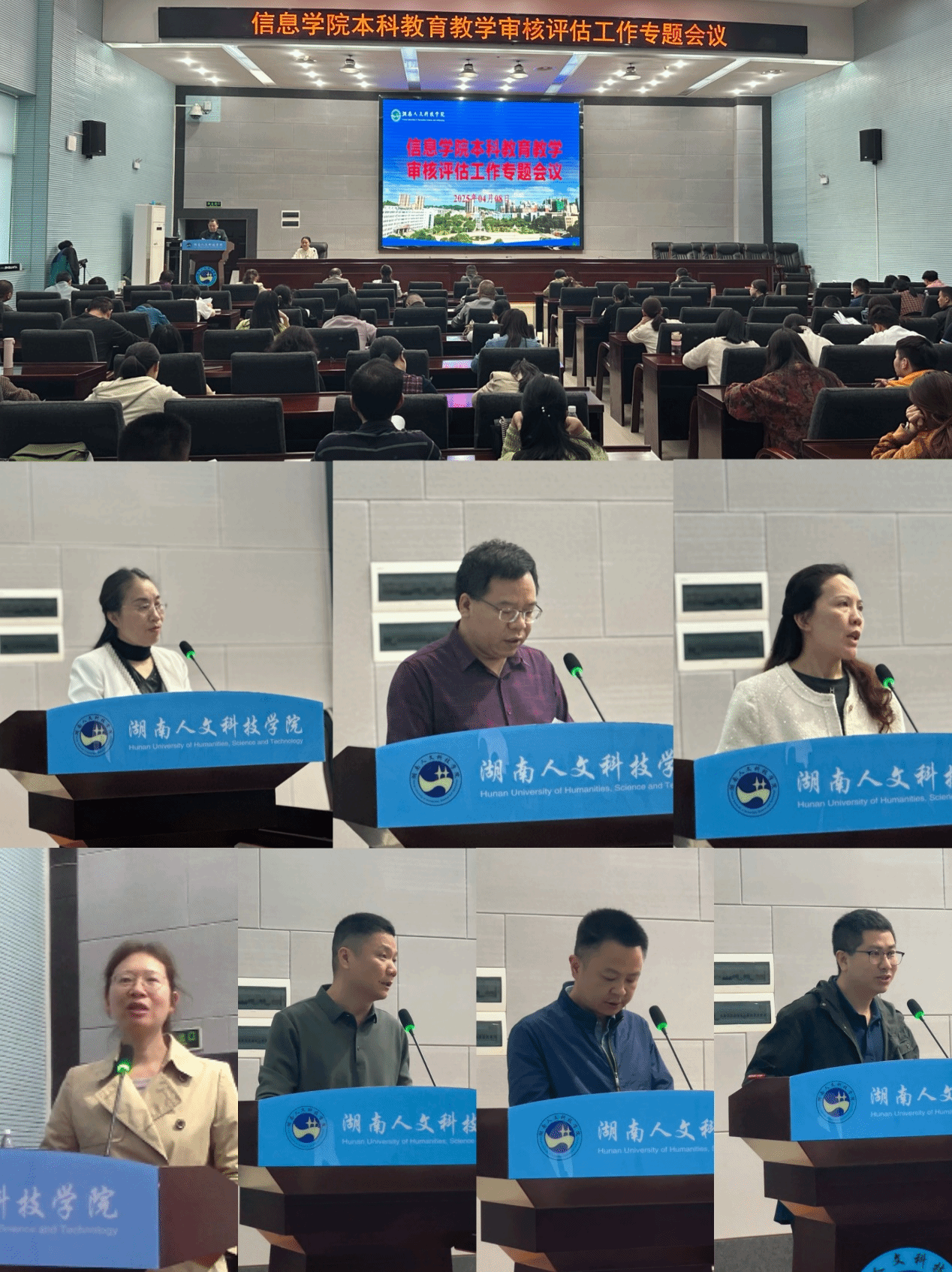 各教研室主任结合专业特色汇报迎评举措。网络工程专业李曾妍号召教师以高度责任感投入评估;电子信息工程专业刘湛分析课程难度与学业预警关联,提出深化校企合作服务湖南“三高四新”战略;软件工程专业肖敏雷建议应对AI技术挑战,改革程序设计课程评价机制;人工智能专业曾增日立足新专业定位,提出构建产教融合的AI人才培养体系。教师代表陈雷、龙海、刘懿从一线视角分享感悟,陈雷以“十年育人,静待花开”的故事呼吁教师坚守初心;龙海表示“少抱怨、多担当”,凝聚迎评合力;刘懿提出通信工程专业需加强理论与实践衔接,探索前沿技术融入教学。