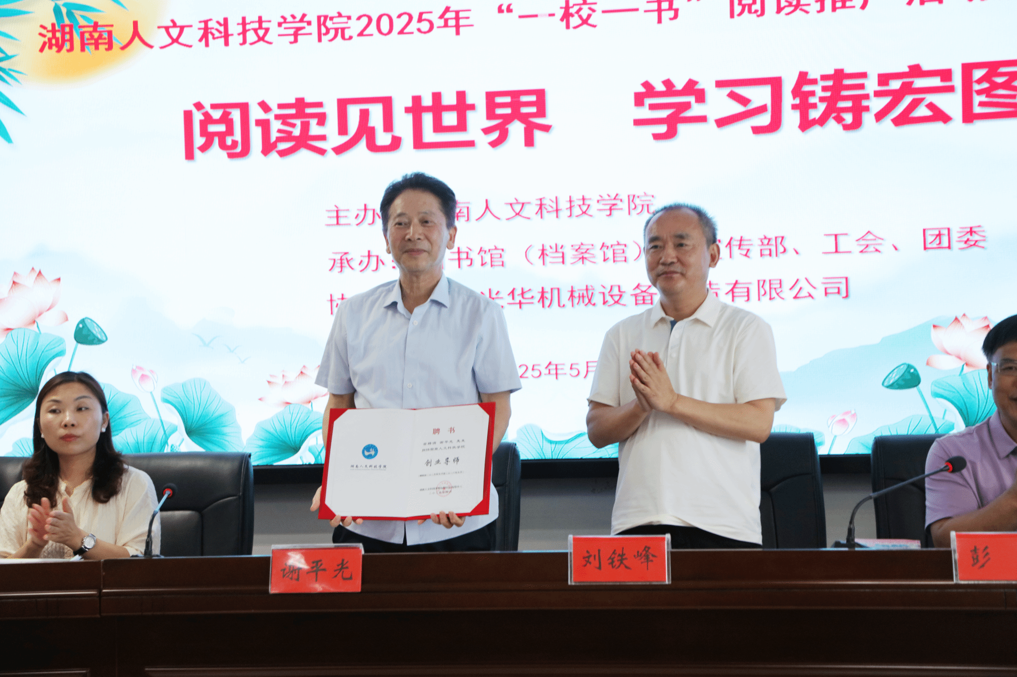 5月20日下午,学校在图书馆415学术交流中心举行了2024年“一校一书”阅读推广活动颁奖典礼暨2025年“阅读见世界 学习铸宏图”阅读推广活动启动仪式。副校长刘铁峰出席,娄底光华机械设备制造有限公司董事长谢平光、党委宣传部、团委、工会等相关部门负责人及师生代表参加。启动仪式由图书馆(档案馆)馆长彭辉主持。