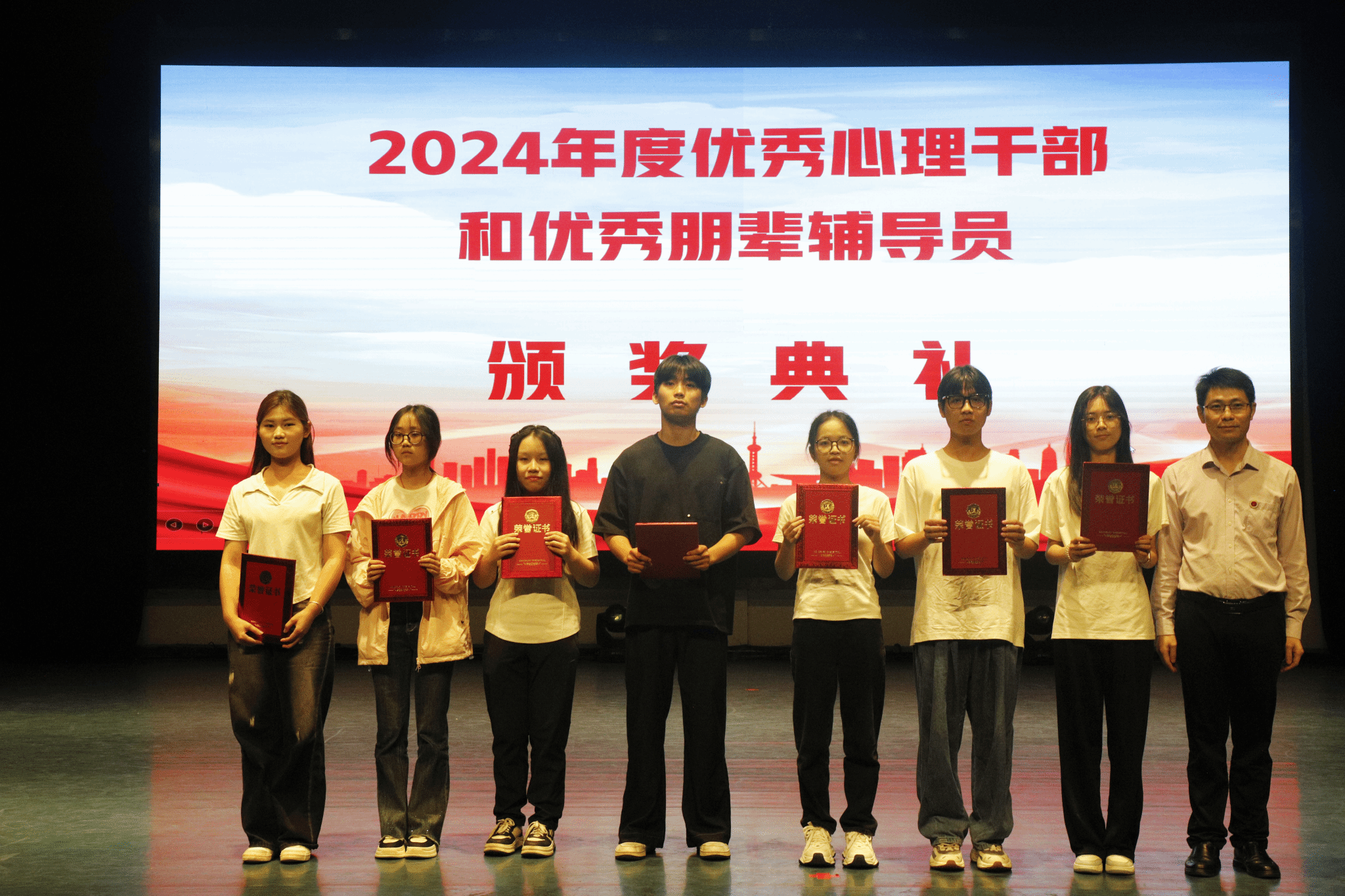 此次大赛历经初赛、复赛的层层选拔,最终5个节目脱颖而出进入决赛,参赛选手们紧扣校园学习生活、职业规划、亲子关系、人际关系等贴近学生实际的话题,将学生在面对自卑、抑郁、校园欺凌等困境时的心理危机、烦恼困惑,以及他们寻求帮助、获得成长的心路历程,以生动鲜活的舞台形式展现得淋漓尽致。这种独特的呈现方式,让参赛选手和观众在潜移默化中受到启发与教育。赛场气氛热烈,各参赛队伍竞相角逐,精彩不断。最终,体育学院的《彼方尚有荣光在》凭借精湛的表演、扣人心弦的剧情以及积极向上的主题,斩获大赛一等奖;教育学院的《镜中迷宫》、文学院的《阳光下的阴影》荣获二等奖;音乐舞蹈学院的《向阳而生》、法学院的《拨雾》、能源与机电工程学院的《心光再现》荣获三等奖。为发挥榜样引领作用,活动现场还对2024年度优秀心理干部和优秀朋辈辅导员进行了表彰。