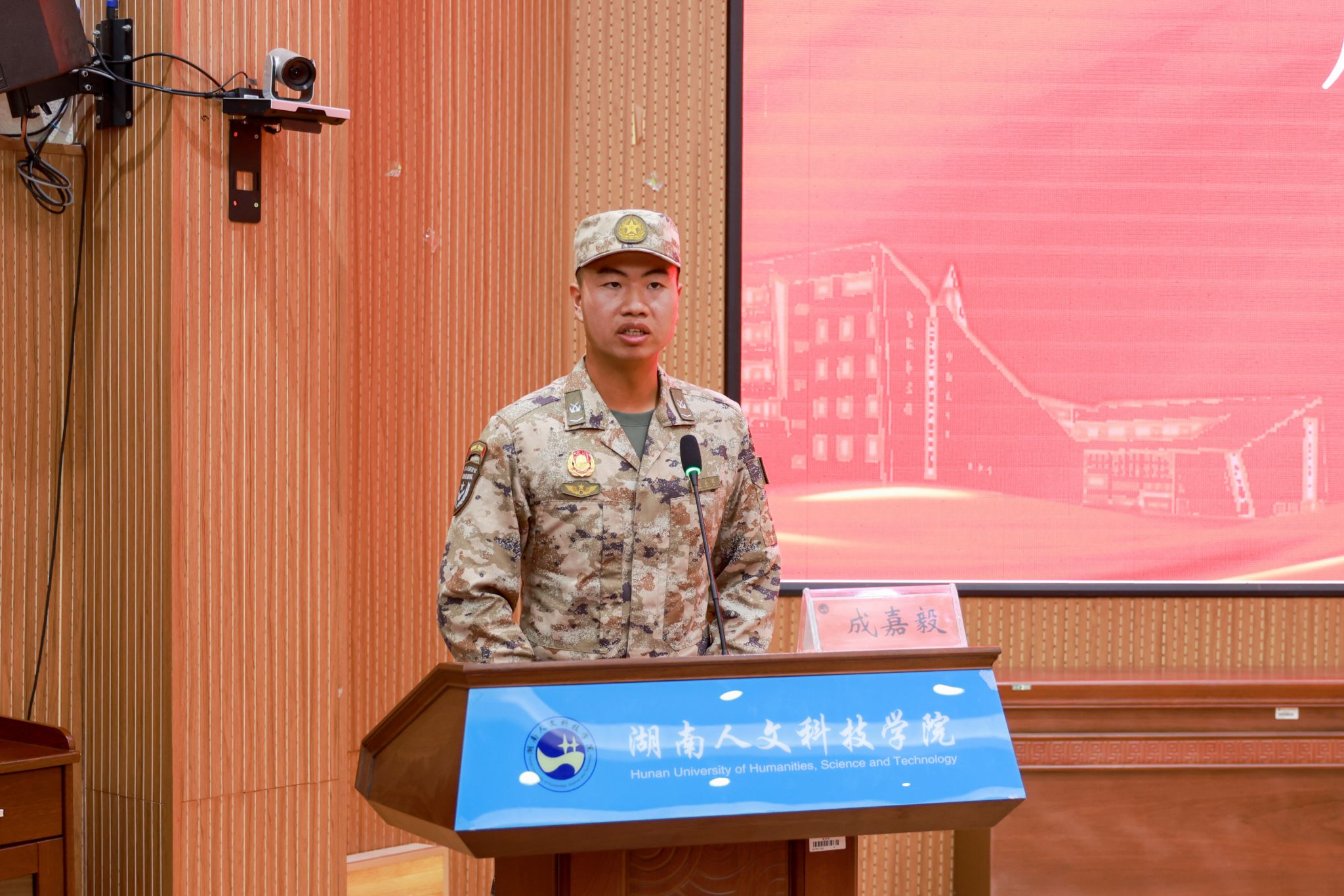国防教育宣讲环节中,信息学院成嘉毅同学结合自身参加“9·3”阅兵的亲身经历作精彩分享。他以真实的阅兵故事,生动诠释了“青春因军旅而璀璨,人生因奋斗而无悔”的深刻内涵,激发了在场同学们的从军热情和报国信念。