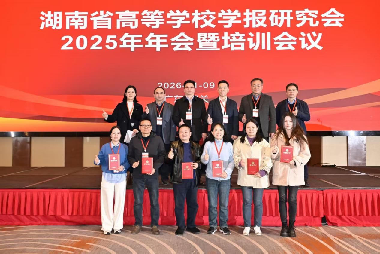 1月8日至11日,湖南省高等学校学报研究会2025年年会暨培训会议在广东韶关举行。会上,beat365学报编辑部获评为“湖南省高等学校学报研究会2025年突出贡献单位”,编辑部主任杨国辉获评“突出贡献个人”,编辑彭巍颐荣获湖南省高校学报研究会征文二等奖及“优秀编辑”称号,由邓景文编校的《论中国青年在中国式现代化进程中的使命担当》一文获评“主题宣传好文章”。