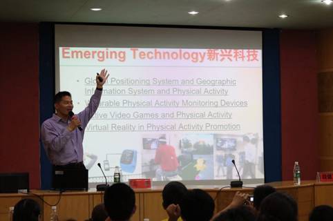 高赞教授在讲座现场就当前美国最为流行和前沿的体力活动干预方法及系列研究成果进行了详细的阐述,重点对体感游戏运动、虚拟现实等高科技新产品应用于传统的体力活动干预研究中进行了详细的讲解。最后,高教授还与广大师生进行了互动,回答了大家关心的问题,并介绍了美国学校体育的现状,为我们了解国外的体育教育现状以及出国深造带来了一场别开生面的讲座。(体育学院供稿)