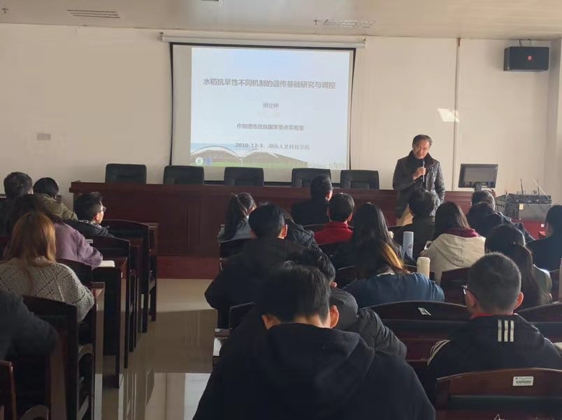 熊立仲教授讲学主题为《水稻抗旱性的遗传基础与调控机制》,他首先介绍了国内外水稻抗旱性研究现状,阐述了作物抗旱的复杂性、主要生理机制及现实意义;重点介绍了其团队近年专注水稻抗旱研究的科研成果,具体阐述了一种基于图像性状的表型组学的研究新思路;同时详细介绍了bZIP类的转录因子OsbZIP23基因的发现过程以及基因功能解析的研究思路。熊教授的学术报告让广大师生了解了最前沿的水稻科研进展,启发了同学们的科研兴趣,他还建议农生院结合地方特色,专注于特定方向深入开展研究。