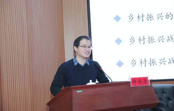 报告会上,许源源教授首先从乡村振兴战略的提出背景、思想源流、理论内涵、实施意义和面临难点说起,对乡村振兴战略进行了全面解读;然后,围绕乡村振兴战略与精准扶贫、三农问题、新型城镇化、乡村治理等公共管理领域的重点问题进行了深入系统分析,并提出了乡村振兴战略是精准扶贫战略的升级,乡村振兴的标志是农业强农民富农村美,乡村振兴战略不能否定新型城镇化战略,乡村振兴战略是新时代乡村治理的抓手等重要观点。最后,许教授就乡村振兴战略实施过程中的常见问题与部分教师和学生进行了互动交流。