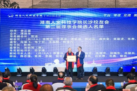会上选举产生了新的长沙校友会常务理事会成员。姜正国当选为顾问,傅胜龙当选为会长,阳凌当选为常务副会长,喻国强、宁勇虎、汤能湘、扶记云、龚吉堂、吴建波、朱睿、颜盛军、向雄飞、毛丁初、王光朝、陈自力当选为副会长,彭扬当选为秘书长,汤能湘当选为监事长,符学锋当选为常务副秘书长,李寒佳、侯曙辉、刘业红、伍益中、戴锡东、肖建兵、邹朋远、陈志强、高涛、朱晨、詹信志、张平、王锡兵、刘长奇、毛鑫、杨光当选为副秘书长。姜正国、刘铁铭、刘和云、刘铁峰、朱强等为常务理事会成员颁发了聘书。