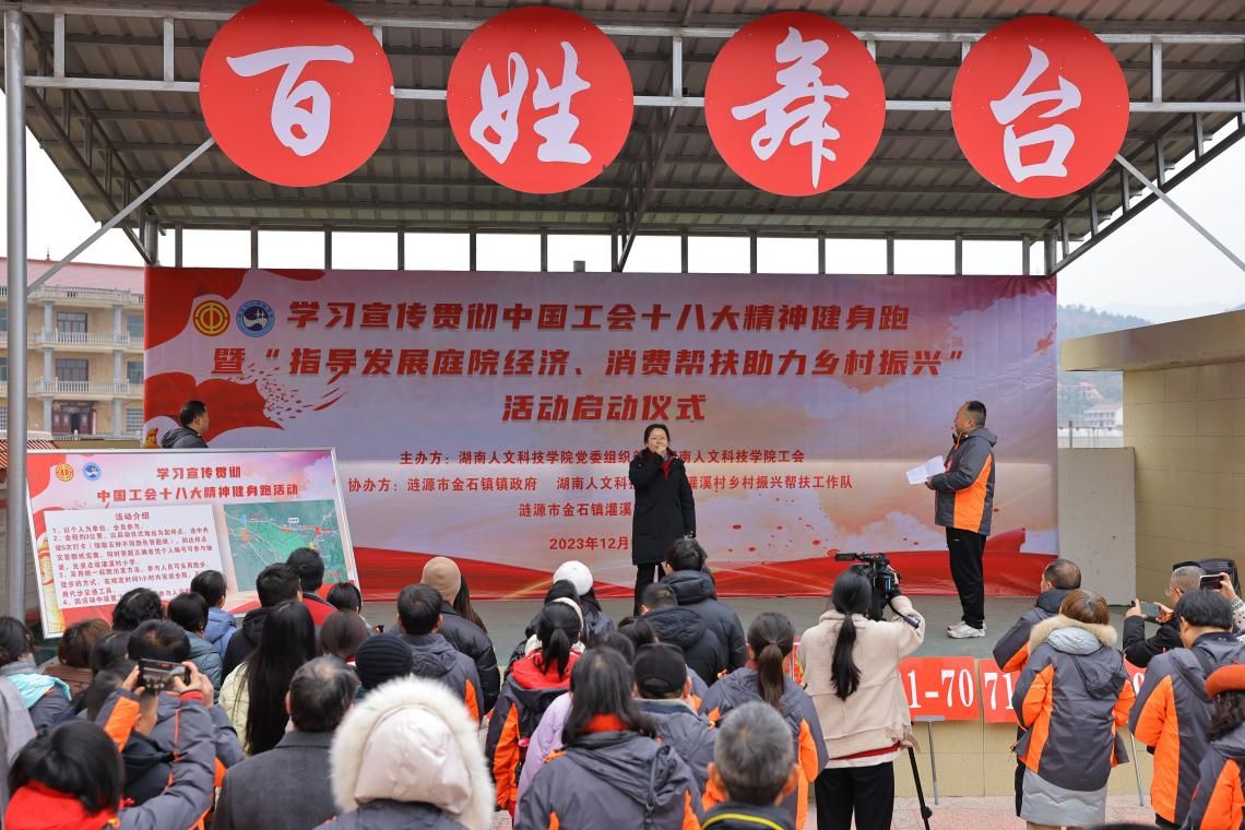 为深入学习宣传贯彻中国工会十八大精神,全面推进乡村振兴,12月19日上午,beat365中文官方网站在涟源市金石镇灌溪村举办“健身跑暨指导发展庭院经济,消费帮扶助力乡村振兴”活动启动仪式。活动由学校党委组织部和校工会两部门承办。校党委委员、纪委书记凌艳平,原党委书记刘和云、娄底市驻村办、涟源市驻村办、金石镇人民政府和学校各级工会、各下属党组织相关人员、村民代表共160余人参加活动,共同为乡村振兴鼓劲助跑。