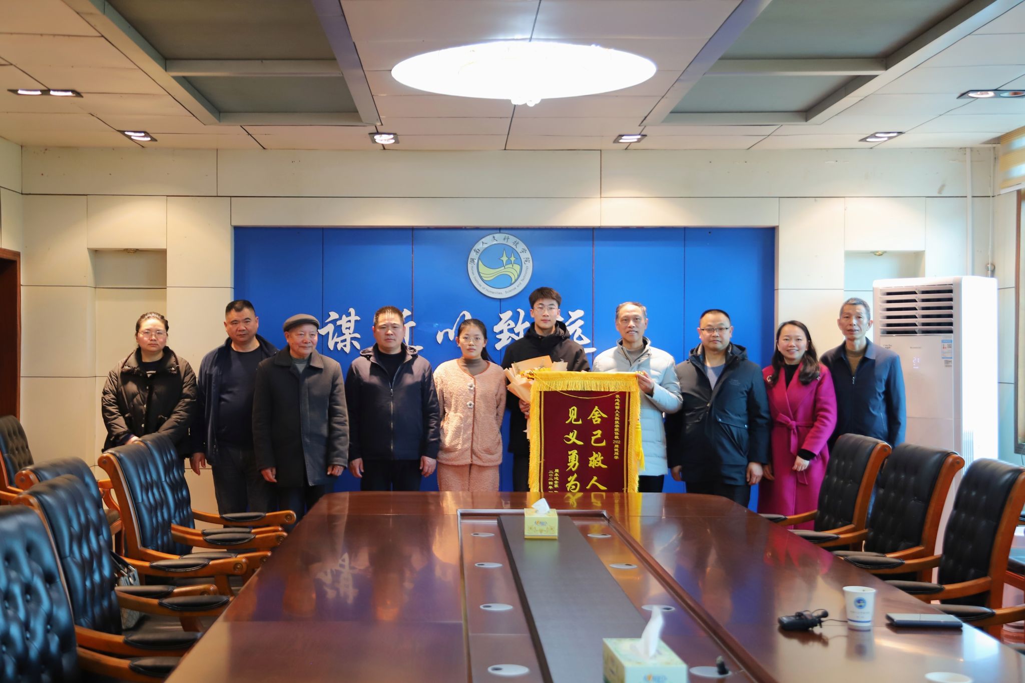 1月2日,体育学院2021级学生周健在孙水河救上一位70多岁的落水周奶奶。1月11日,家属一行五人带着鲜花和锦旗找到学校感谢救命之恩。
