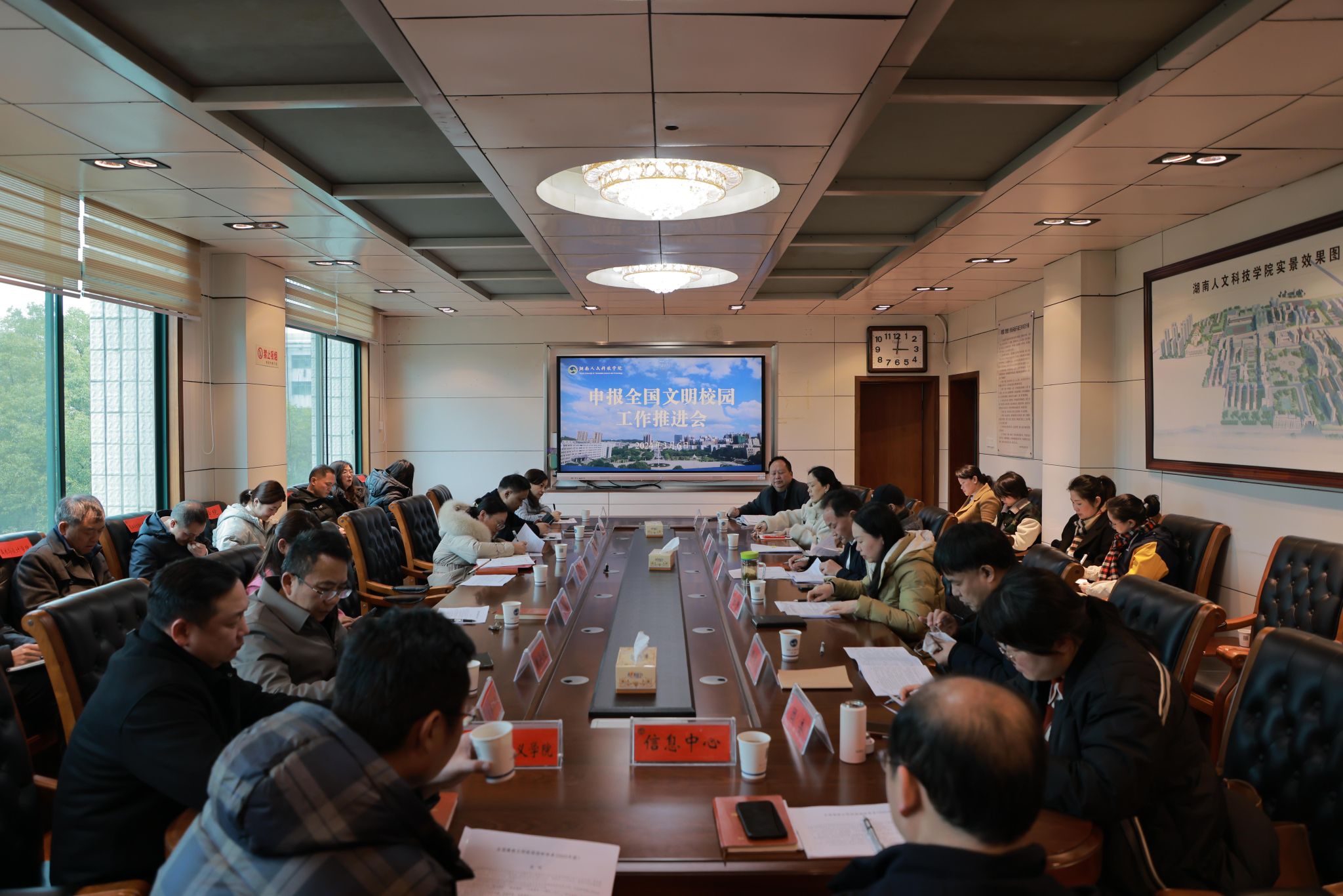 3月6日下午,学校在明德楼一会议室召开申报全国文明校园工作推进会。党委副书记朱强出席,相关职能部门和二级学院负责人参会。宣传统战部常务副部长谢柳主持。