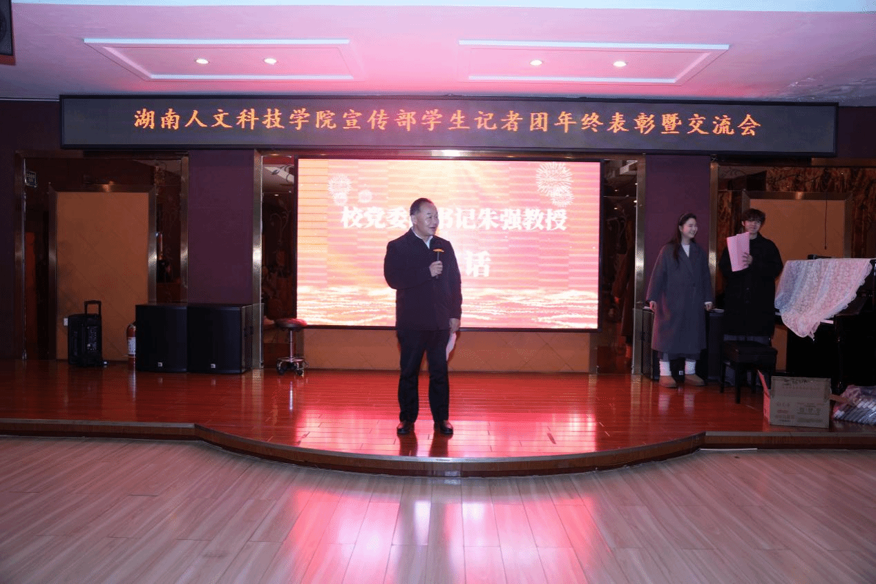 12月14日晚,党委宣传部在教职工之家举行了学生记者团2024年度表彰暨交流会,校党委副书记朱强教授出席并讲话,宣传部常务副部长谢柳、副部长田密、全体老师和学生记者团成员参加,活动由广播台罗振宇和邱菁怡主持。