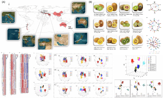 A 猕猴桃主产国采样点分布ArcGIS图;B 样本及剖面图;C多变量建模判别;D市场盲样预测