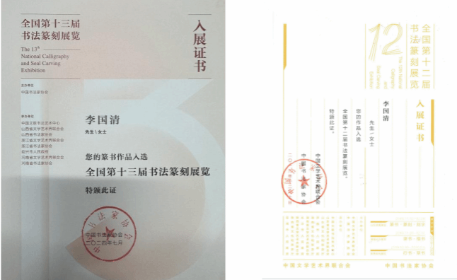 李国清是中国书法家协会会员,他的书法作品发表于《中国书法》《中国书法报》《书法报》等核心期刊,论文《南社书法活动及文人书风》发表于《中国书法》等。他的书法作品被中国文字博物馆、省美术馆以及兰亭书法博物馆等收藏,在各类国家级、省级展览中获奖、入展达百余项,在全国第十三届、第十二届书法篆刻展、全国第五届正体书法展等中国书协重要展览中都有他的成绩,还荣获全国大中小学教师书法大赛一等奖。