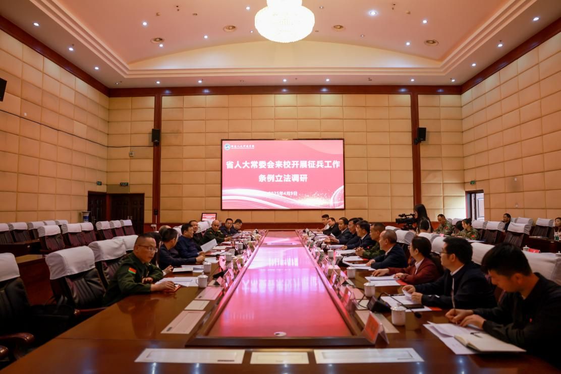 4月9日上午,省人大常委会党组成员、副主任陈飞一行来校开展《湖南省征兵工作条例》立法调研。省人大法制委员会主任委员肖迪明,省人大社会建设委员会副主任委员唐勇,省军区动员局局长李道银,娄底市委书记邹文辉,市人大常委会党组书记、主任戴德清等省、市领导参加调研座谈。校党委副书记、校长盛明科,党委委员、副校长刘铁峰,党委副书记朱强,党委委员、纪委书记凌艳平等陪同参加。盛明科主持调研座谈会。