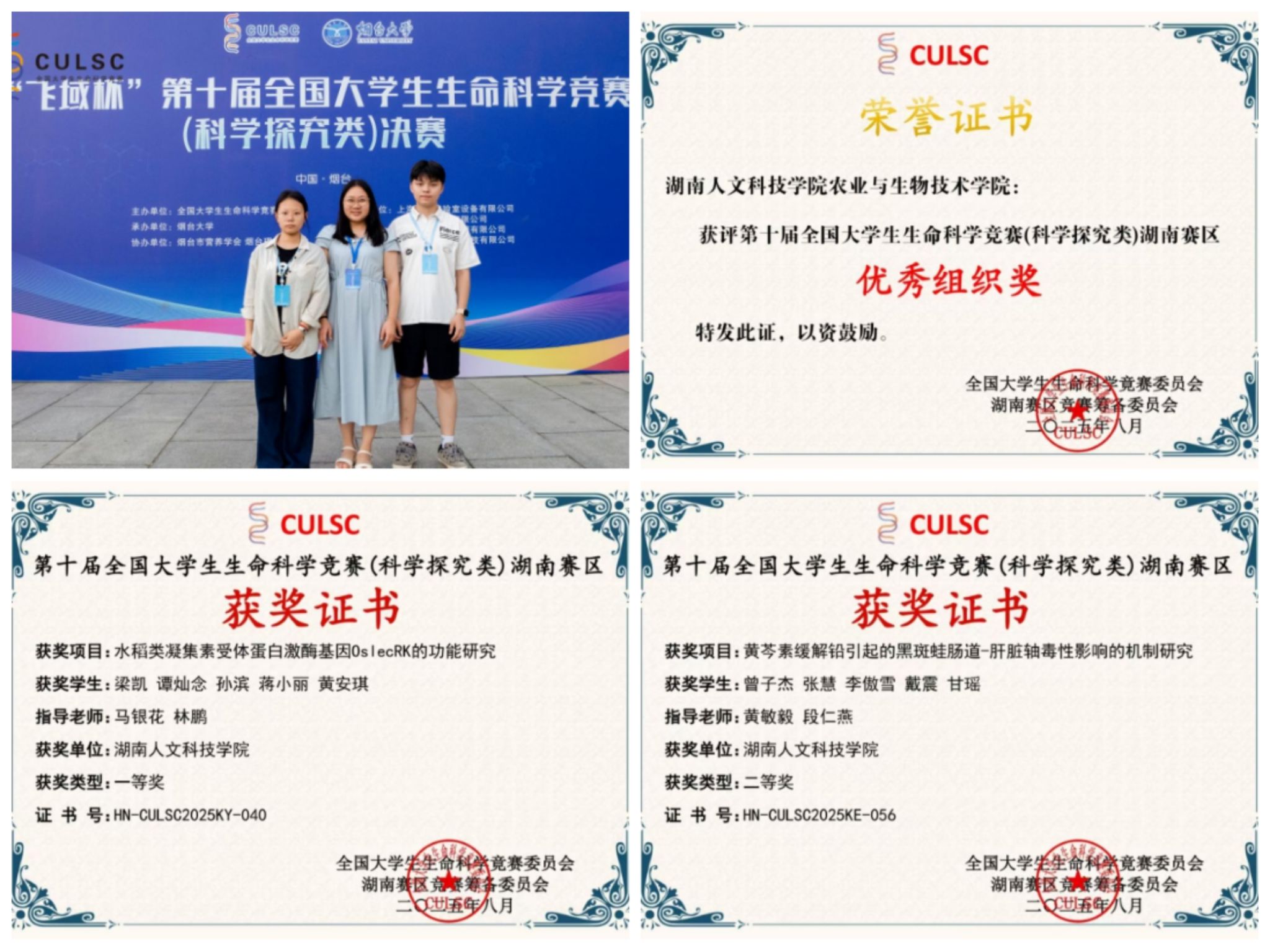 7月27日至28日,第十届全国大学生生命科学竞赛(科学探究类)决赛在烟台大学进行。全国共有695所高校的21304支队伍参赛,共评出一等奖494项,二等奖761项,三等奖2277项。beat36528支队伍参加比赛,3支队伍晋级省级决赛,1支队伍入围国家级决赛,经过激烈角逐,beat365共获国家级二等奖1项,三等奖6项,省级三等奖5项。其中,马银花和林鹏老师指导的项目“水稻类凝集素受体蛋白激酶基因OslecRK的功能研究”(学生:梁凯等)荣获国家级二等奖/省级一等奖;黄敏毅老师指导的项目“黄芩素缓解铅引起的黑斑蛙肠道-肝脏轴毒性影响的机制研究”(学生:曾子杰等)荣获国家级三等奖/省级二等奖;余书奇和谢晶老师指导的项目“基于网络药理学联合生物信息学探讨黄精抗结直肠癌的作用机制”(学生:雷光鑫等)荣获国家级三等奖/省级二等奖,beat365获省级优秀组织奖。