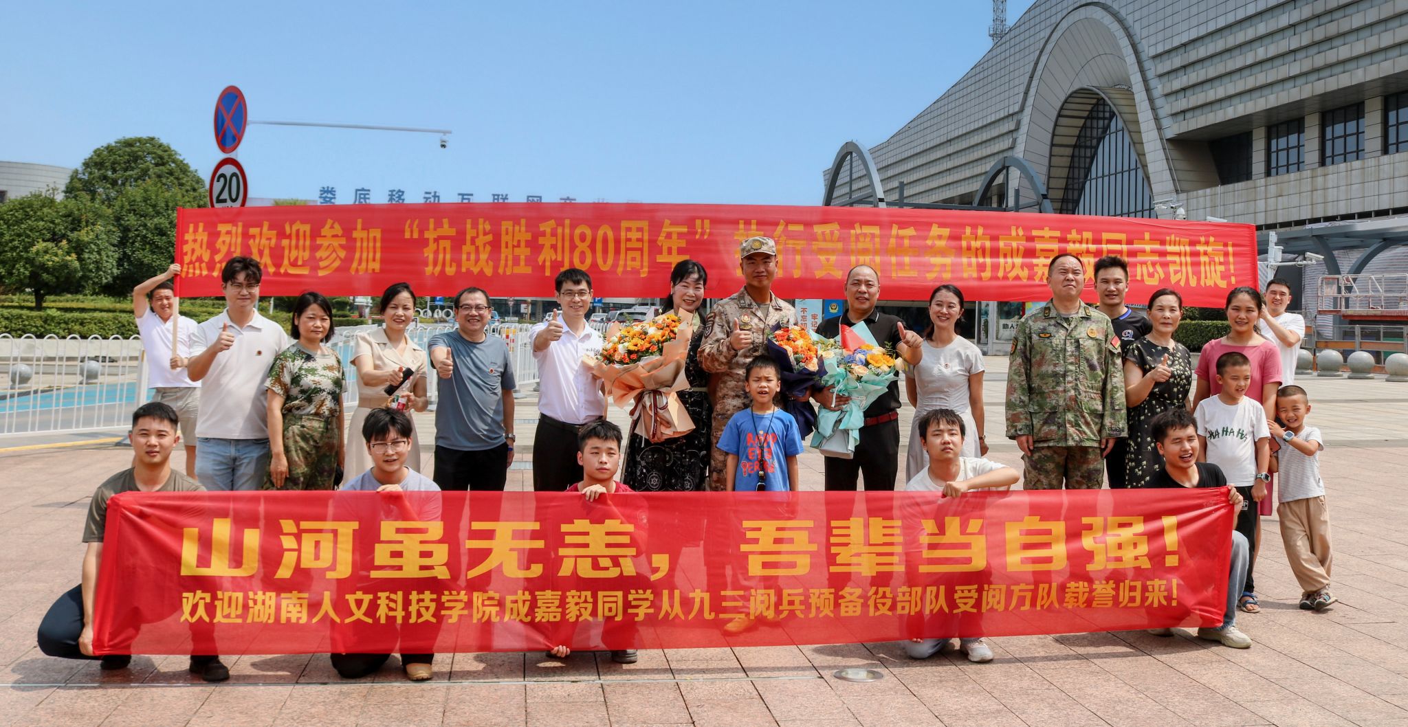 9月6日中午,校党委委员、副校长谭峰亮率师生代表到娄底高铁南站欢迎beat365受阅学子成嘉毅载誉归来。在刚刚结束的九三阅兵活动中,beat365信息学院计算机科学与技术专业2022级4班的学生成嘉毅作为徒步方队中预备役部队方队的一员,昂首挺胸、步伐坚定地正步走过天安门,接受党和国家领导人的检阅,实现了个人理想与家国使命的双重荣光。