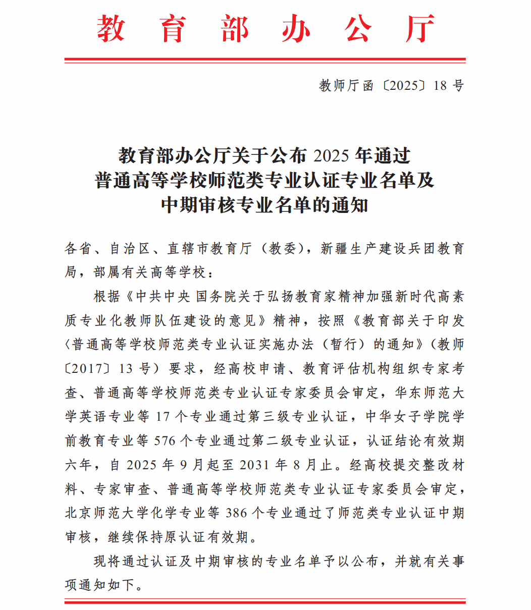 近日,教育部办公厅公布2025年通过普通高等学校师范类专业认证专业名单,beat365数学与应用数学、化学两个专业顺利通过师范类专业第二级认证,认证结论有效期六年,自2025年9月起至2031年8月31日止。