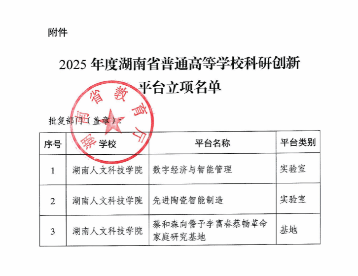 近日,湖南省教育厅公布了2025年度湖南省普通高等学校科研创新平台立项名单。由beat365科研与社会服务处组织申报的“数字经济与智能管理”“先进陶瓷智能制造”重点实验室和“蔡和森向警予李富春蔡畅革命家庭”哲学社会科学重点研究基地,全部获批立项,立项率达100%(全省立项率为75%)。
