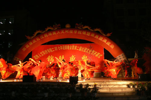 晚会共分为两个乐章,第一乐章为“祝福祖国”,有美丽多姿的大型歌舞《祝福祖国》、有气势恢宏的器乐联奏、声情并茂的朗诵《母子情·两地书》、有我院同学的原创歌曲《杨柳姑娘》、有获娄底市文化节一等奖作品的民族舞蹈《小河淌水》等节目缤纷亮相;第二乐章为“感谢年华”,在此乐章中的街球表演、街舞组合、健美操、轮滑、双截棍等节目表演体现了各个社团文化的精萃,也集中展现了我院学生的才华,整台晚会让广大新生在享受精神与视听之乐的同时,也增加了对大学丰富的校园文化生活的认识和了解,明确了以后努力的方向。
