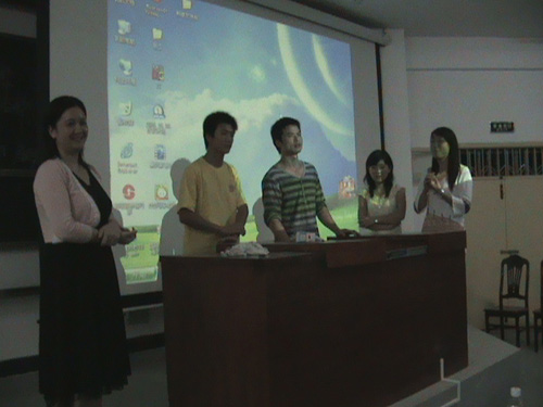 本次报告会由外事办张玲主任和中文系暑假赴泰国泰北皇家理工学院交流的两名学生刘素凤、陈晔主讲。有中文系党总支书记李夫泽同志主持,中文系抓学生工作的黄立平副主任和三名政治辅导员在现场指导,全体2007级新生和部分高年级学生参加了报告会。