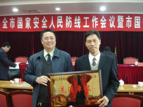 2007年度,我院高度重视国家安全人民防线建设工作,在学院国安工作领导小组的坚强领导下,保卫处在加强内部防范、情报信息收集、配合国家安全机关开展工作等方面扎实有效地开展工作,侦破处理了一批案子,取得了良好的成绩,为学院和社会的稳定和发展做出了积极贡献,被评为娄底市2007年度国家安全人民防线建设工作先进单位,并于2007年12月6日在全市国家安全工作会议上受到省、市领导表彰和奖励。