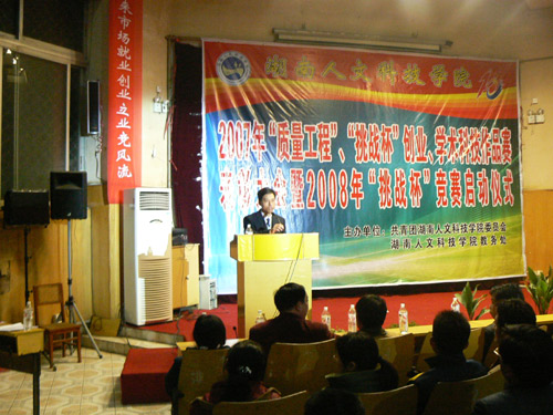 2008年1月8日晚7点,由院团委、教务处举办的2007年“质量工程”、“挑战杯”创业、学术科技作品赛表彰大会暨2008年“挑战杯”竞赛启动仪式在图书馆报告厅隆重举行。参加此次大会的有院党委书记黄懿斌,党委委员、副院长刘和云,党委委员、党办院办主任李高海,院长助理刘铁铭,院长助理蒋建初,科技处处长彭秧锡,院科协主席罗良才和各系分管团工作的领导、团总支书记、指导老师出席了大会。表彰大会由院长助理刘铁铭同志主持。