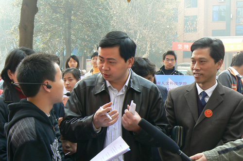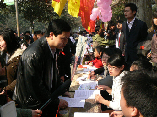 3月1日上午8:00,由院团委组织的“参与志愿服务、建设两型社会”“三·五”学雷锋活动在春园步行街隆重拉开序幕。团省委副书记颜海林同志、团省委办公室主任李华军同志在市人大副主任刘波、市政协副主席李海江、团市委康艳华书记、我院院长助理刘铁铭教授、团委副书记周海强、谢柳及各系分管团工作的领导的陪同下,莅临现场指导工作。