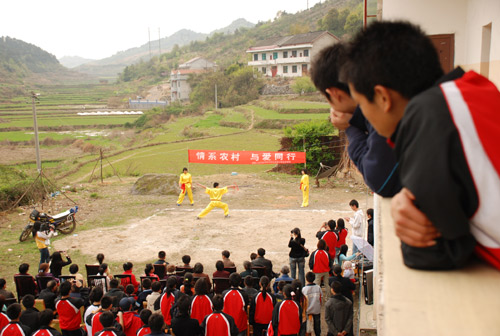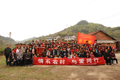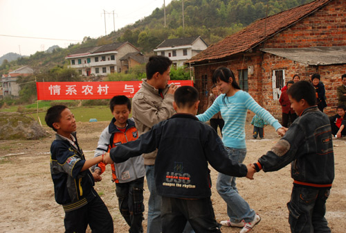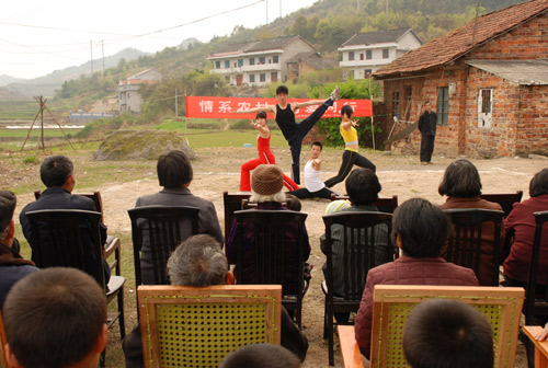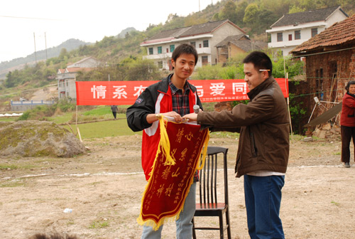 3月25日,体育系07级社体班全体同学在系领导、班主任带领下,在山青水秀的大科乡水洋村村活动中心举行了一场别开生面的慰问演出活动。简陋的舞台并未影响同学们激情表演,热烈奔放的健美操、刚劲矫健的武术、时尚动感的T台秀、朴实感人的话剧,并与水洋村小朋友积极互动……赢得了村民的热烈掌声。我系学生向村里留守儿童赠送了慰问金,并为当地困难户送去了生活用品,水洋村村委会也赠送 “心系山村、情义精神”的锦旗表示诚挚谢意,充分展示了beat365中文官方网站与水洋村人民的深厚情谊。