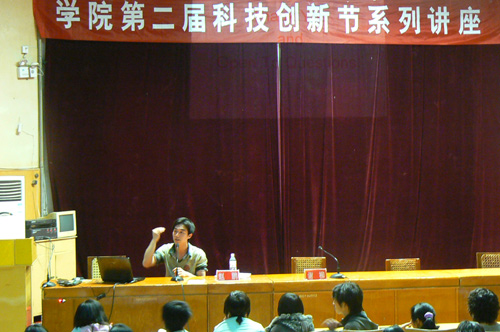 4月11日晚7:00,由院团委举办的第二届科技创新节系列讲座在图书馆报告厅隆重开讲。全省第二届“挑战杯”创业大赛金奖、国家银奖得主、现中南大学商学院硕士赵鹏应邀为我院师生做了“挑战一次,挑战一生”的精彩讲座。院团委书记侯建斌等院团委领导、各系团总支书记和“挑战杯”参赛团队参加了此次活动。讲座由院团委谢柳副书记主持。