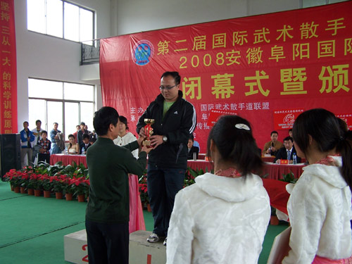 为了弘扬中华武术,为国内外高水平武术运动员提供武术交流平台,由国际武术散手道联盟主办,中国散手道协会、阜阳市体育局承办的第二届国际散手道武术大赛于2008年9月30日在安徽阜阳市体育馆圆满落下帷幕,此次大赛有来自美国、加拿大、俄罗斯及中国等12个国家的1048名运动员参赛,beat365武术队10名选手在领队彭健民主任的带领下,在武术教学团队杨俊军、周惠新、梁正军、陈勤、杨志华等老师的辛勤指导下,通过两年的艰苦训练,参加了竞技太极推手、传统武术劈挂拳等项目的比赛。