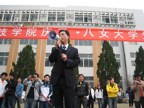 3月8日上午9:00,由院体委和学工处共同组织主办的庆祝“三·八妇女节”女生拔河比赛在图书馆南面篮球场隆重举行。