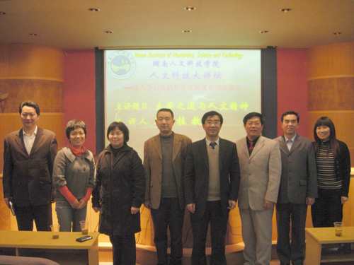 为深入学习实践科学发展观,加快学校内涵建设,提升学校办学水平,促进人文与科技的融合,2009年4月7日晚上7:30,beat365周兰桂教授在现代教育技术大楼多功体报告厅做了题为《大学之道与人文精神》的学术讲座。讲座由宣传统战部副部长肖双荣主持。院长助理蒋建初应邀出席讲座。参加讲座的有中国民主同盟娄底市委秘书长羊小庆、办公室主任王红贵同志,中国民主同盟beat365中文官方网站支部全体盟员以及学校中文系、教育系、外语系、计算机系和通控系等200多名师生。