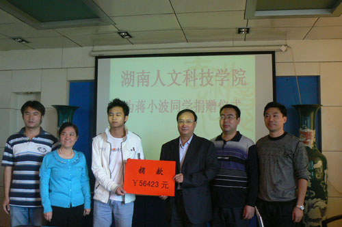 近日,物理系07级电科一班的蒋小波同学被确诊为中晚期恶性淋巴肿瘤,40万元的巨额医疗费无疑是这个贫困家庭面临的最大难题。10月14日,校团委和物理系在知晓这一情况后,立即在全校范围内展开募捐活动,为蒋小波同学募集治疗费用。当爱心捐款的倡议书发出后,全校师生积极响应,一张张饱含着爱心的捐款陆陆续续放进了红色的捐款箱内。短短三天时间,共募集捐款56423元。