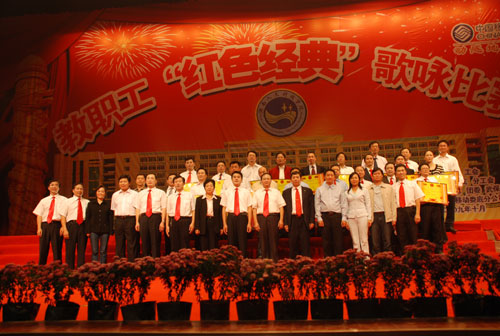 物理与信息工程系演唱的《歌唱祖国》拉开了晚会的序幕。老师们豪情满怀,纷纷登台演唱,缅怀革命先辈的丰功伟绩,歌唱社会主义建设的伟大成就,用歌声抒发热爱祖国、热爱学校的美好感情。《东方红》、《保卫黄河》、《爱我中华》等一支支经典歌曲将大家带回了红色岁月,让人感受到时代跳动的脉搏。比赛高潮迭起,观众情绪激动,现场气氛非常热烈。最后,机关党总支、外语系、后勤服务总公司等3个党总支获得一等奖,体育系等7个党总支获得二等奖,通控系等9个党总支获得三等奖,机关党总支、后勤服务总公司等2个党总支获组织奖,音乐系获特别表演奖,离退办党总支获特别支持奖。