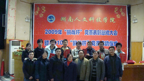 会上,团委书记周海强对2009年“挑战杯”竞赛的情况做了全面总结。刘和云同志宣读了表彰名单,获奖的团队代表、优秀指导教师和优秀组织单位一一上台领奖。随后,学生代表张梦成和石戈峰,优秀指导老师蒋乐蓉,优秀组织单位的系部领导游训龙、伍骏江分别在会上作了经验介绍。
