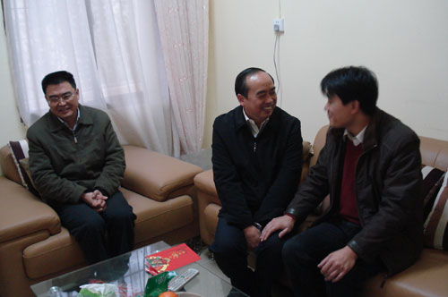 2月2日上班时间才到,林武、姚兵一行已来到学校党委书记姜正国家里,在姜书记家里,林武书记仔细询问了他家小孩的学习情况和爱人的工作情况,与姜博士畅谈了学校2009年取得的辉煌成绩和今年的工作打算。听到学校在全省的“专升本”高校中排列前三名,去年获得的17个国家、省级一等奖中有15个是国家一等奖时,林武书记连说学校真的不错,办学质量可以与老牌大学争锋了,预祝学校在今年的“专升本”高校评估中取得好的结果。姜书记非常感谢市委、市政府对学校和他本人的关心与支持,表示学校在“硬件”基本达到教育部要求的情况下,今年将主要加强“软件”建设,促使学校更上一个台阶。最后,林武书记欣然与姜书记夫妇合影留念。