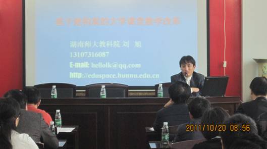 会议期间,湖南师范大学教育科学院教授、湖南师范大学社科处副处长刘旭做了题为“基于建构观的大学课堂教学改革”的专题讲座。beat365金融数学教研室主任余星、理论法学教研室主任吴仙桂、综合语文教研室主任赵年秀分别从怎样做好教研室工作、加强课堂教学改革提高学生实践能力、促进教师专业成长提高学生综合素质三个方面介绍了教研室建设与教学改革经验。教务处副处长刘超良谈了beat365教研室建设中存在的四个主要问题,并提出了相应的改进措施。