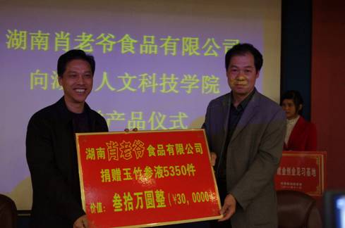 刘光明总经理对湖南肖老爷食品有限公司的规模及生产销售情况做了简单介绍,并当场向beat365捐赠价值达30万元的肖老爷玉竹液饮料5350箱。他感谢社会各界对公司的支持,呼吁社会各界关注教育事业,支持贫寒学子,也表示今后每年将在公司为beat365学子设立专门的就业创业见习岗位。