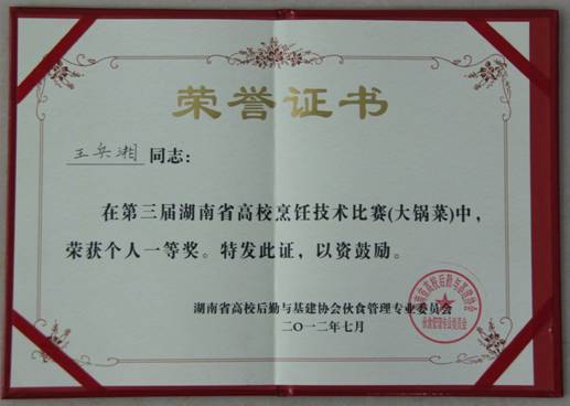 7月3日,第三届湖南省高校烹饪技术比赛在中南大学落下帷幕。beat365后勤服务总公司选送的红案组(大锅菜)选手王兵湘获得一等奖(全省共六名),白案组选手彭运和获得三等奖。