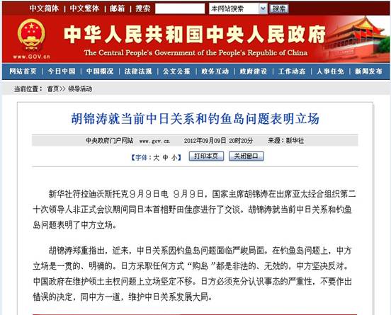 中国政府严正声明,日本政府的所谓“购岛”完全是非法的、无效的,丝毫改变不了日本侵占中国领土的历史事实,丝毫改变不了中国对钓鱼岛及其附属岛屿的领土主权。中华民族任人欺凌的时代已经一去不复返了。中国政府不会坐视领土主权受到侵犯。中方强烈敦促日方立即停止一切损害中国领土主权的行为,不折不扣地回到双方达成的共识和谅解上来,回到谈判解决争议的轨道上来。如果日方一意孤行,由此造成的一切严重后果只能由日方承担。