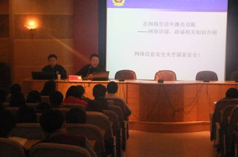 讲座的题目是《在网络生活中擦亮双眼》。肖队长从信息分析与辨别方法、网络信息的搜索技巧、网络信息及网络谣言辨析、提示与启发等四个方面为学生做了精彩讲述。他以案例分析形式重点讲解了网络谣言辨析的方法、技巧,强调指出,网络谣言容易造成人身伤害,影响正常法治,扰乱社会秩序,严重时可能还会危及国家安全。肖队长的报告具有以下鲜明特点:信息量丰富、知识面广,课件制作精美、图文并茂,理论紧密结合实际、案例分析与逻辑推理周密谨严,语言朴实、风趣生动。讲座让大学生学到了网络文化的重要知识,也让他们深刻懂得了网络信息安全关乎国家安全的真正含义。