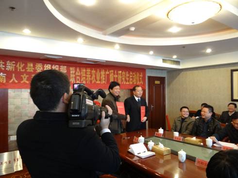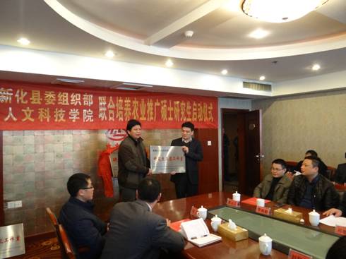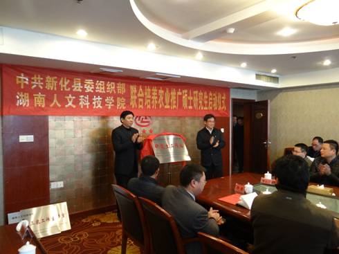 在热烈庄重的气氛中,刘和云校长和王汪部长分别代表学校和新化县委组织部签定了研究生联合培养协议,郭军书记和胡忠威书记共同为“研究生工作站”揭牌,刘和云校长向曹家镇和奉家镇授予了“beat365中文官方网站研究生三农工作室”牌匾。