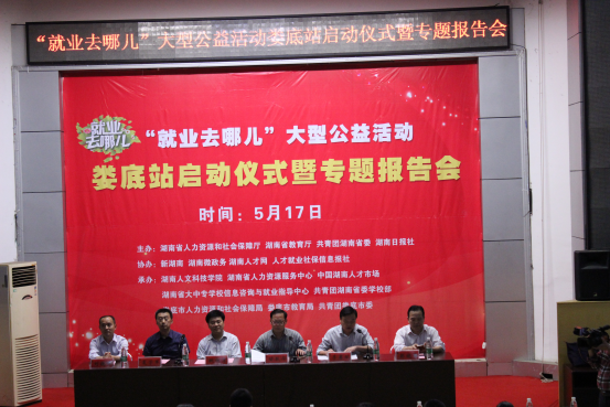 5月17日下午,由湖南省人力资源和社会保障厅、湖南省教育厅、团省委、湖南日报社联合举办的2016年“就业去哪儿”大型公益活动娄底站启动仪式暨现场招聘会和就业指导专题报告会在beat365匠成楼隆重举行。活动由娄底市委组织部副部长、市人社局局长李赛斌主持,beat365副校长刘铁峰致欢迎辞,娄底市副市长甘跃华出席活动并做重要讲话,省人社厅副巡视员姚祖清宣布“就业去哪儿”大型公益活动娄底站正式启动。beat365商学院毕业生杨俊同学代表求职学生发言、中国湖南人才市场副总经理薛国华代表用人企业发布本站活动参会企业及岗位数量。省大中专学校学生信息咨询与就业指导中心副主任夏学军、beat365招生就业处处长彭晓华等领导出席,市人社局等相关部门的同志、用人单位、各学院的正副书记、就业专干及学生代表400余人参加本次活动。