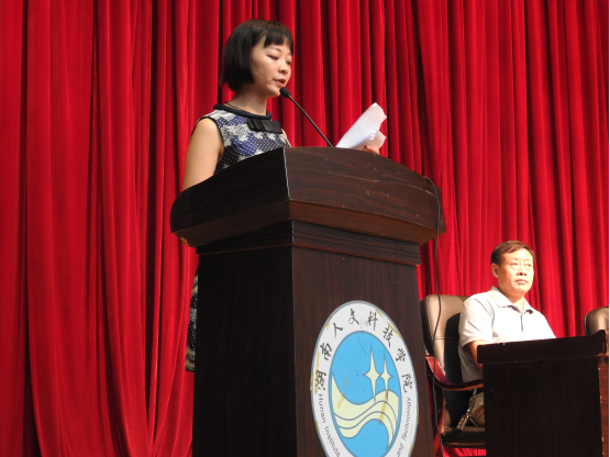 商学院教师李雪芬代表全校教师发言。她鼓励新同学积极主动,开放包容,热情友爱,从容淡定,在大学刻下自己生命的印迹。