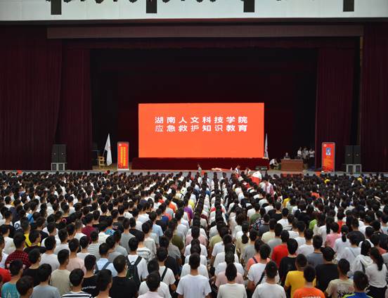 上午8:30,中南大学湘雅医院急诊科副主任李湘民教授为全体新生作应急救护知识教育讲座。李教授结合多年临床急救经验详细讲解了心肺复苏、气道梗阻急救以及有关意外伤害等有关急救知识。随后,娄底市红十字会党组书记、常务副会长曾启明介绍了红十字精神——“人道”“博爱”“奉献”以及红十字送知识进校园的工作宗旨。