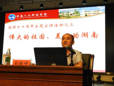 刘铁峰从新中国、新湖南两个层面,阐述了新中国成立70年的辉煌成就。他简要分析了世界形势,通过与美国、印度、日本等国家的经济总量排名、GDP、债务占比、高速铁路和公路发展情况、工业体系完善情况等17项数据进行一一对比,自豪的向同学们展示了70年来祖国走过的光辉历程。湖南美丽的山水、丰富的物产、创新的科技、厚重的湖湘文化……他用一副副生动的照片让同学们看到70年来湖南的发展,并总结为四个跨越:从贫困落后到全面小康的跨越、从百废待兴到百业兴旺的跨越、从内陆封闭到创新开放的跨越、实现了温饱不足到人民幸福的跨越。他指出,总结70年发展经验表明,这些跨越的成功是因为中国道路是成功密码、科学理论是行动指南、改革开放是关键一招、人民群众是力量源泉、党的领导是根本保证。