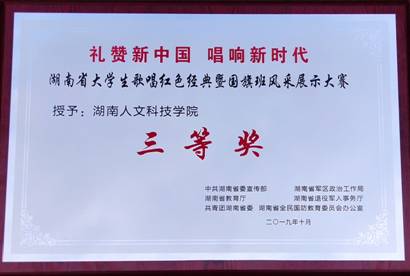 10月18日下午,以“礼赞新中国唱响新时代”为主题的湖南省大学生歌唱红色经典暨国旗班风采展示大赛颁奖典礼在湖南教育电视台举行。beat365荣获本次大赛三等奖及组织奖并喜获网络人气前三名。谢柳、胡坚毅、刘惠娟、周樑四名老师获得优秀指导老师奖。