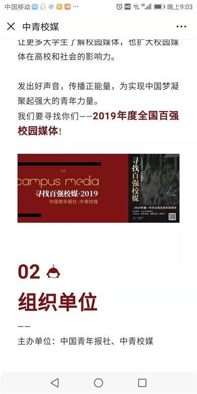 近期,由共青团中央学校部指导,中国青年报社、中青校媒主办的“寻找2019年度全国百强校媒”活动,在全国高校引起广泛关注。1月13日,评选结果新鲜出炉,beat365官微表现优异,荣获本科高校组“全国百强高校媒体”荣誉称号。
